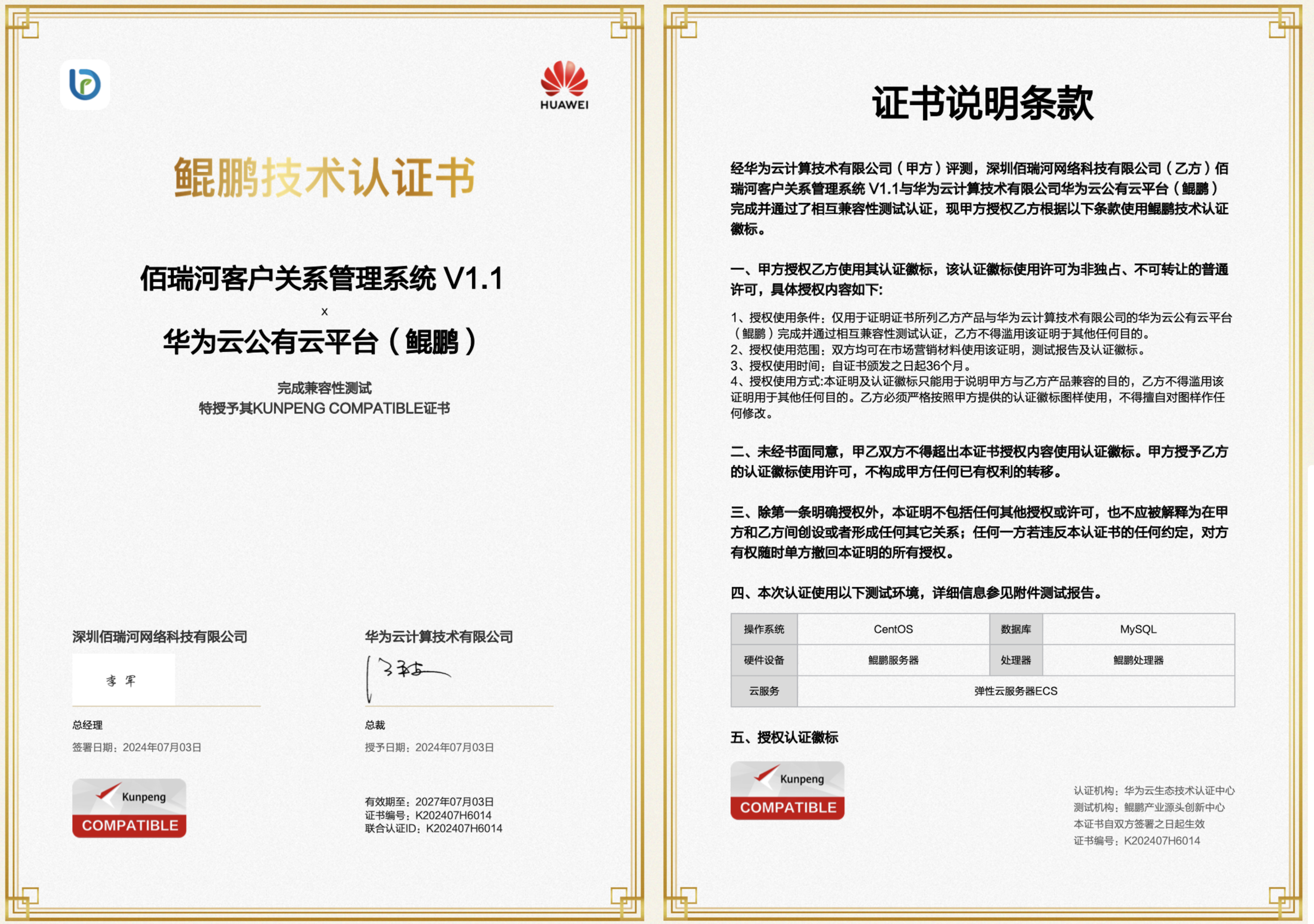 华为鲲鹏技术认证是对系统在华为云公有云平台上的稳定性、性能和兼容性的严格评估,该认证证明了佰瑞河客户关系管理系统在高性能计算与云计算环境中的卓越表现和可靠性。